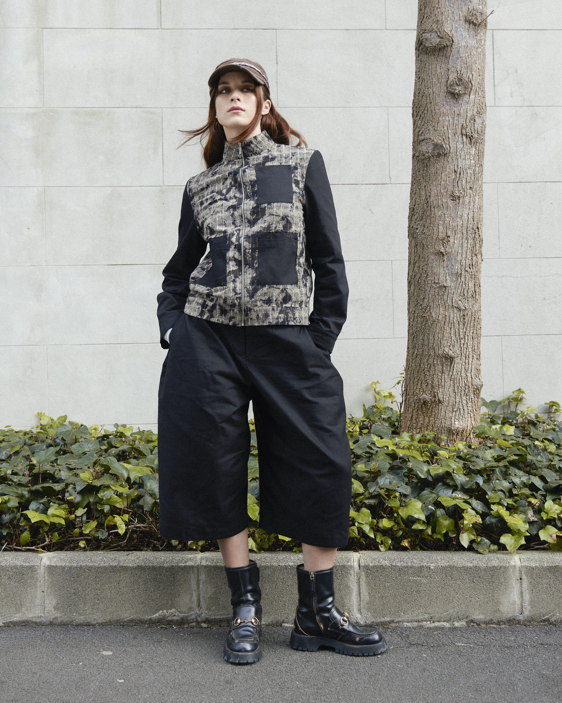 A take on the classic chore jacket. The Lili Jacket features a high neck collar and front zip closure, offering a refined silhouette with everyday practicality. The body is cut in a textural plaid, bringing depth and contrast to the structured black canvas sleeves. Edges on the pockets are left raw, allowing them to naturally fray and evolve with wear.